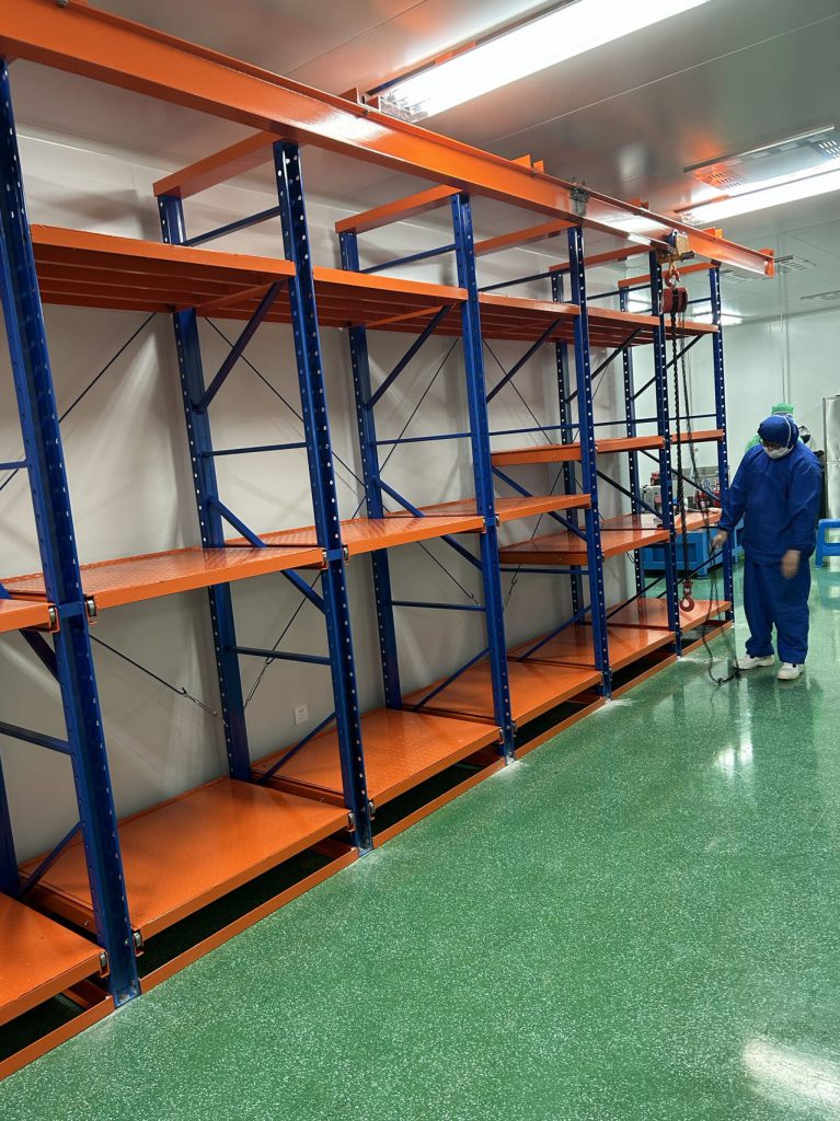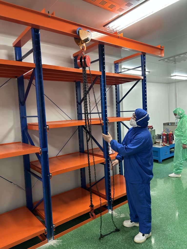 無(wú)塵生產(chǎn)車間采用的是常規(guī)模具存放方式,模具不接觸托盤,模具更換保養(yǎng)后直接配合工字鋼天車存放在模具架上;