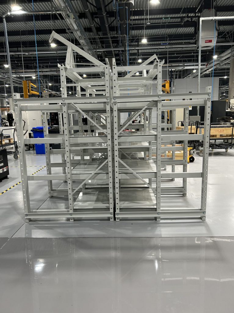 外圍車間選擇底部鏤空式博儲(chǔ)全抽模具架帶工字鋼天車,配手拉葫蘆,底部放置托盤,通過(guò)手動(dòng)搬運(yùn)車存放模具,中間層使用手拉葫蘆配合模具架完成存放;